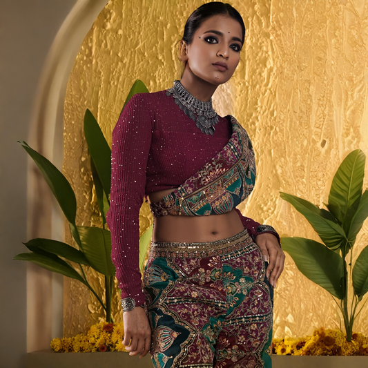 Shringar Pre-Draped Saree is crafted in luxurious pure crepe that flows beautifully with every movement.The saree features a delicate cutdana and sequin border, adding just the right touch of shimmer and sophistication.