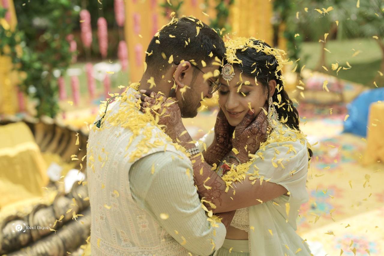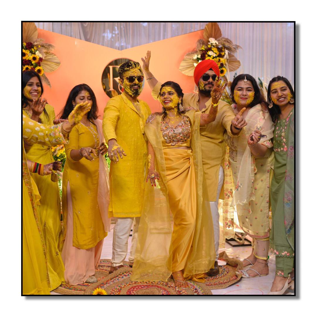 Our beautiful and fun bride Sneha wearing a custom made Label Divya samal piece. It’s a yellow drape skirt with side cowl paired with vibrant embellished top and cape.