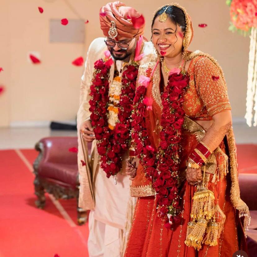 Our beautiful bride Kavita and groom Rahul wearing custom made matching pastel green ensemble.