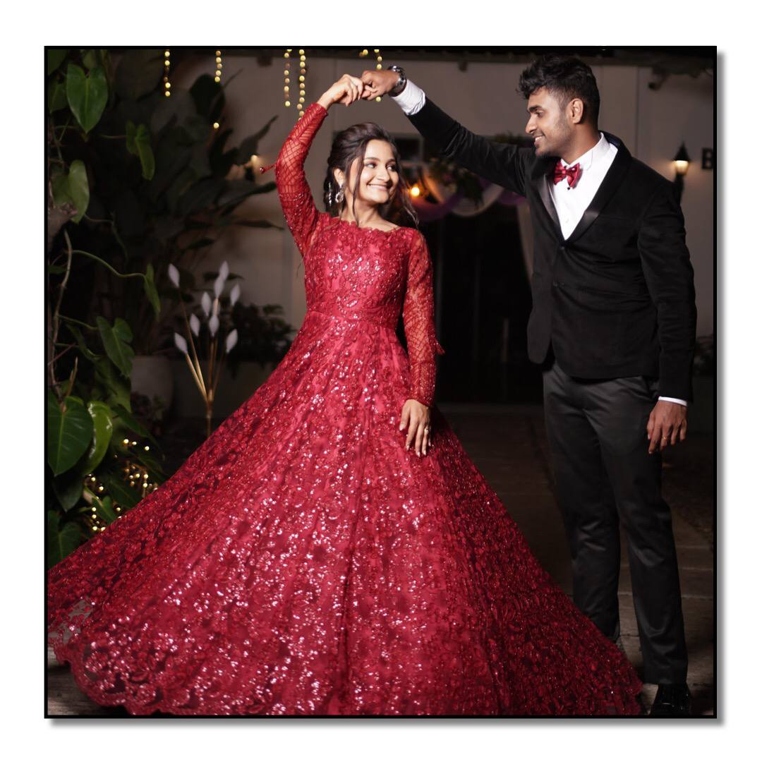 Our beautiful bride Monica wearing custom Label Divya Samal for a fun filled Reception ceremony. It’s a deep red heavily embellished flare gown.