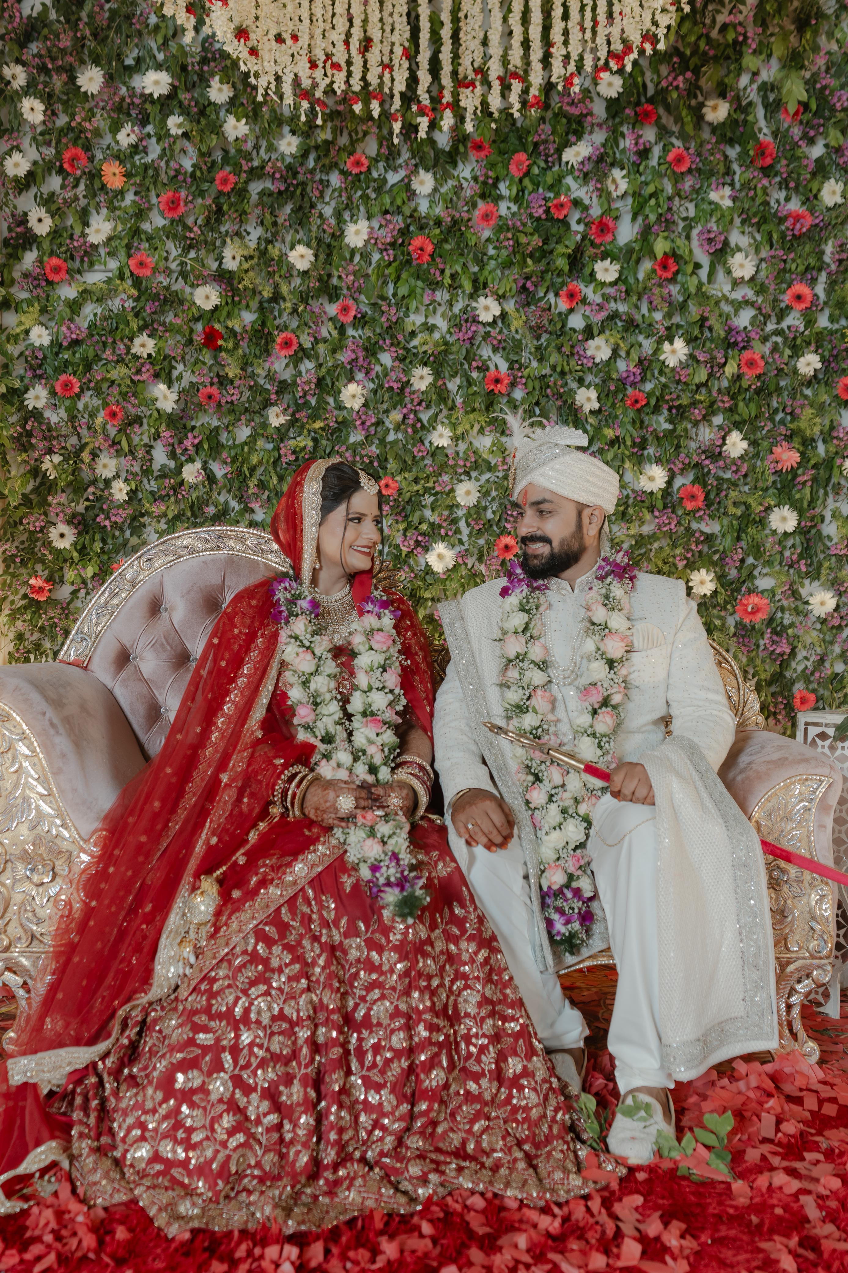 Our beautiful bride Monica wearing custom Label Divya Samal for a fun filled Reception ceremony. It’s a deep red heavily embellished flare gown.