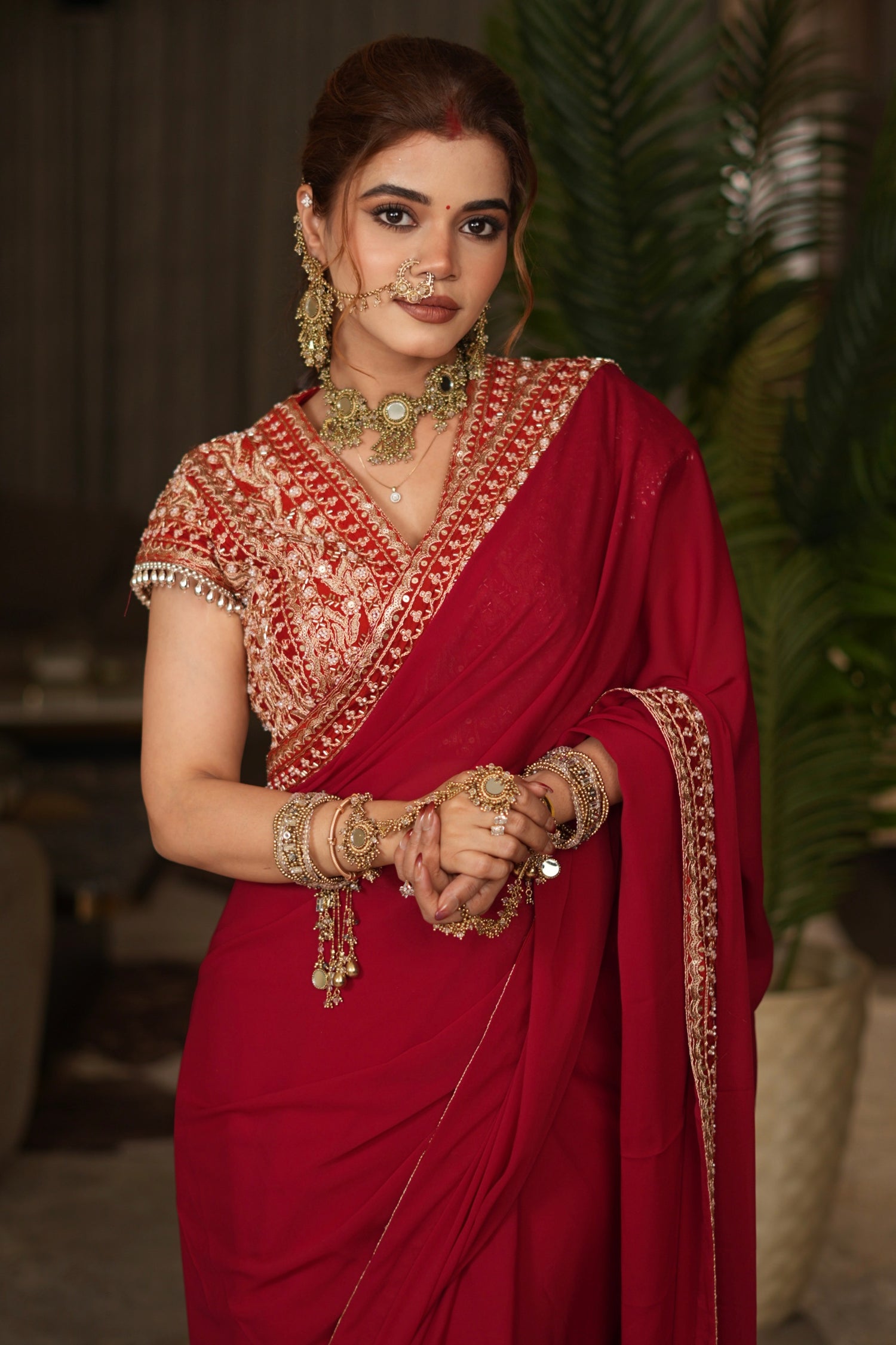 Shringar Pre-Draped Saree is crafted in luxurious pure crepe that flows beautifully with every movement.The saree features a delicate cutdana and sequin border, adding just the right touch of shimmer and sophistication.