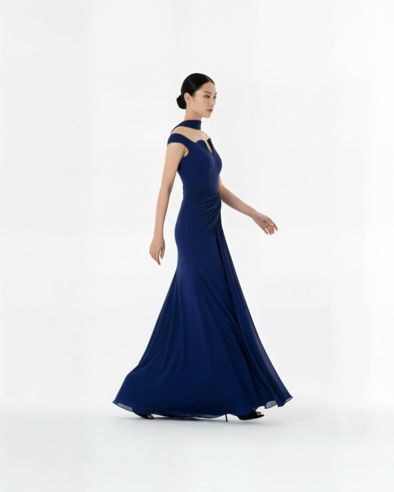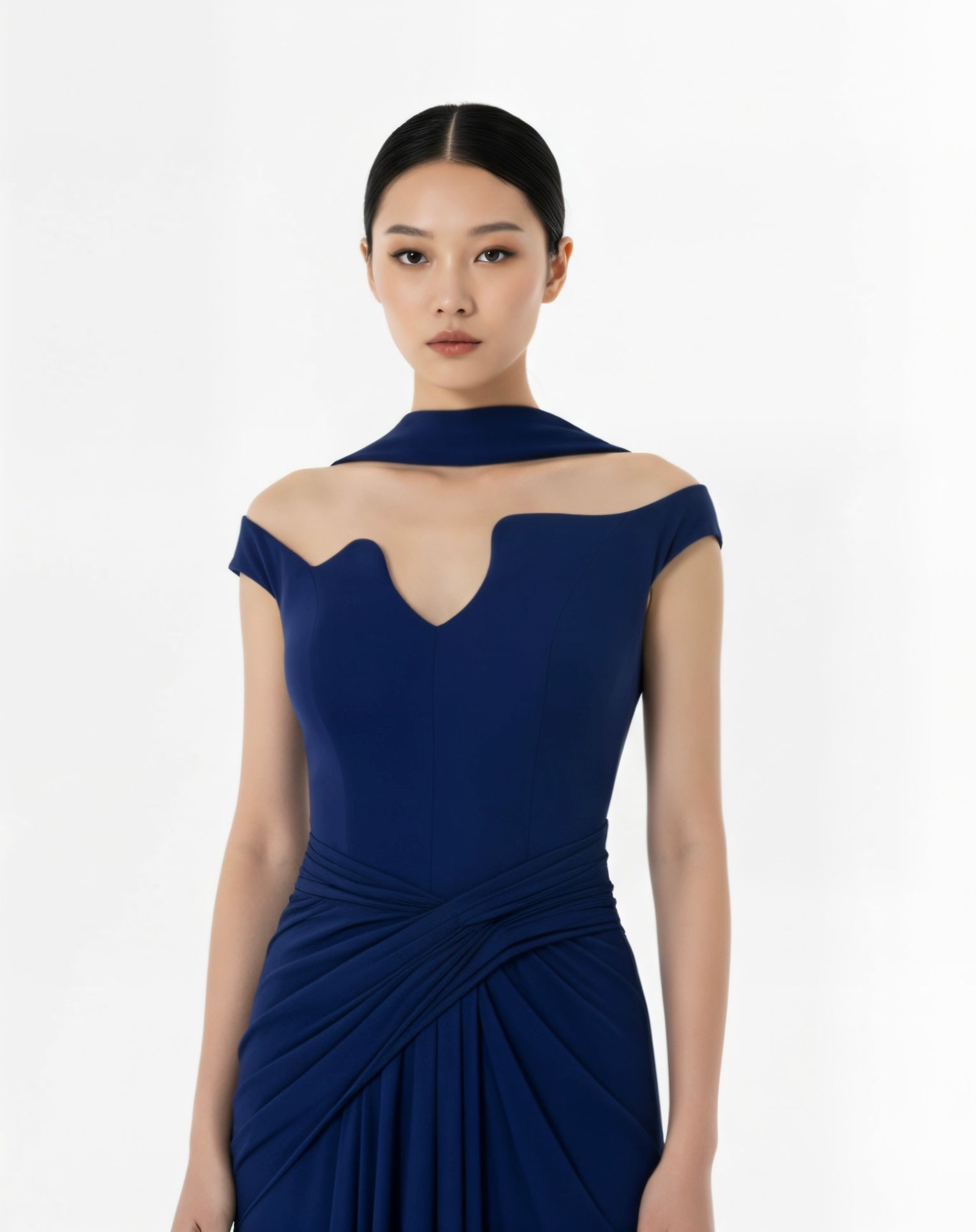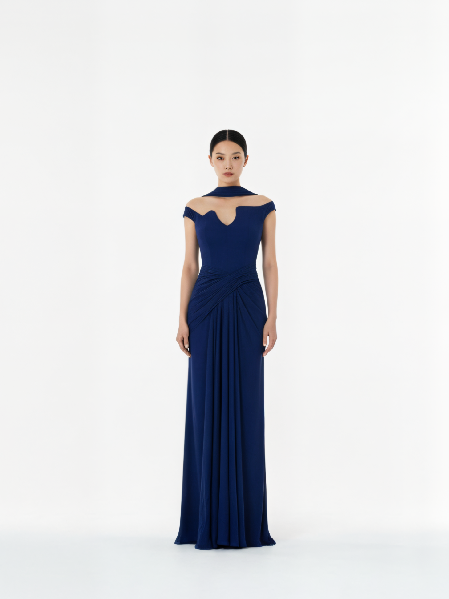 Soft, fluid, and strikingly refined, this deep navy draped gown is a modern ode to understated glamour. The sculpted bodice features an elegant off-shoulder neckline with a subtle cut-out detail that frames the collarbone, lending a sensuous yet poised appeal. Clean lines through the upper body balance structure with softness, creating a silhouette that feels both powerful and graceful.