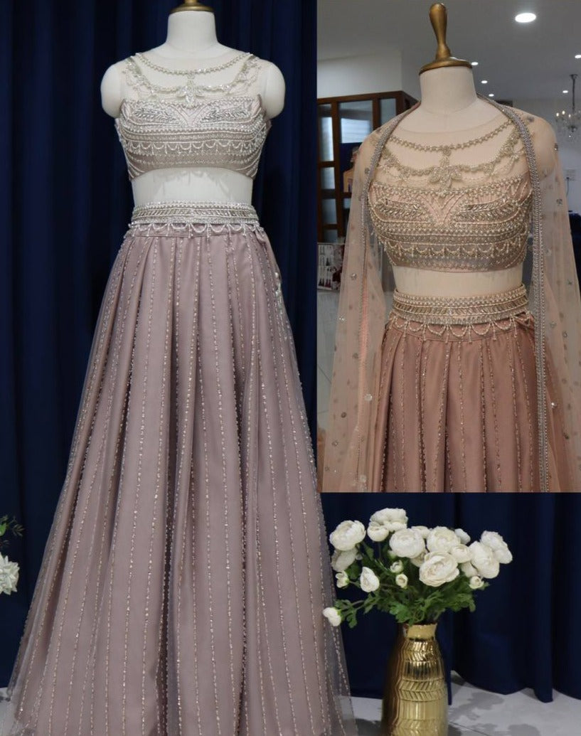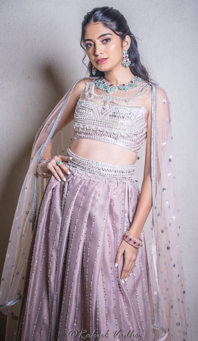 This stunning mauve pink lehenga set is heavily worked and absolutely gorgeous! This ensemble features intricate detailing that adds a touch of elegance to your look.