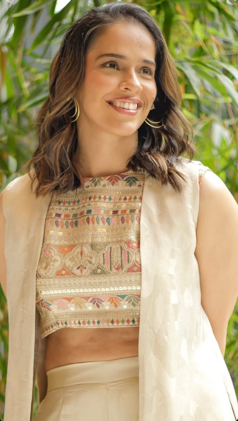 The Divyana Ivory Co-ord Set from our Anantya collection is a sophisticated 3-piece ensemble featuring a pastel multicolor embroidered blouse, paired with shimmer tissue straight-fit pants for a luxe, understated glow. The hero of the look — a long ivory jacket — is delicately finished with multicolor embroidery along the hem, bringing harmony, elegance, and celestial charm to every step.