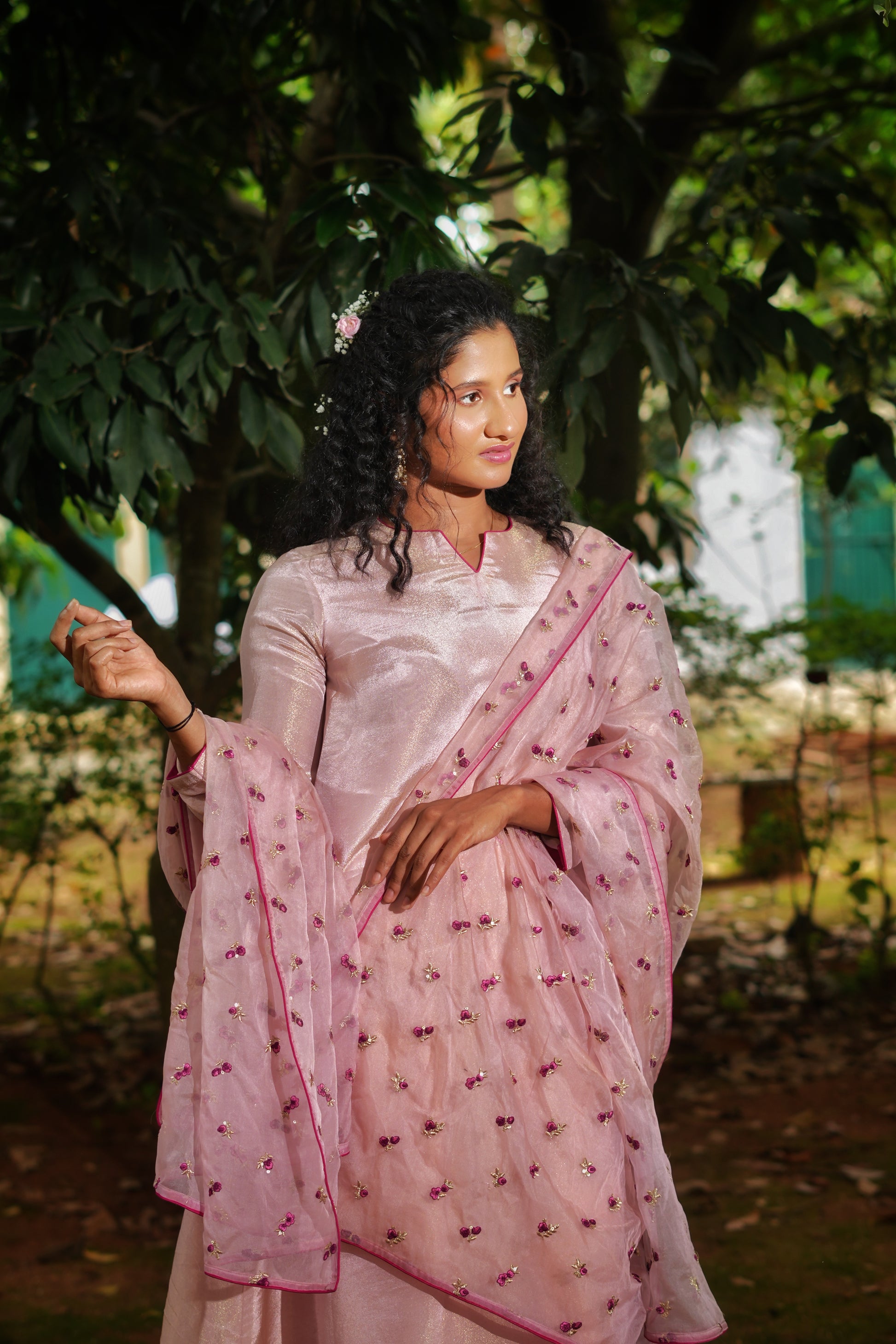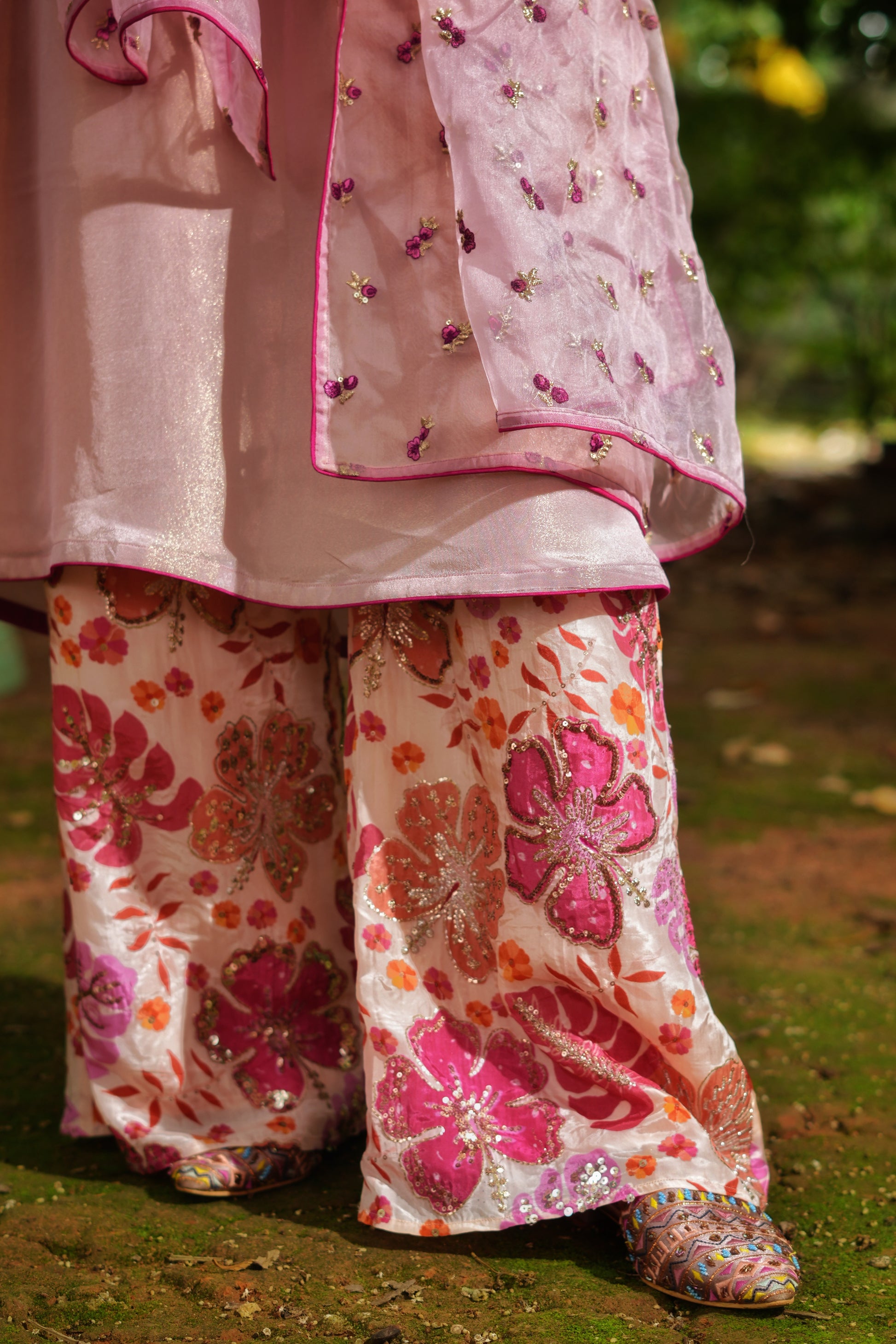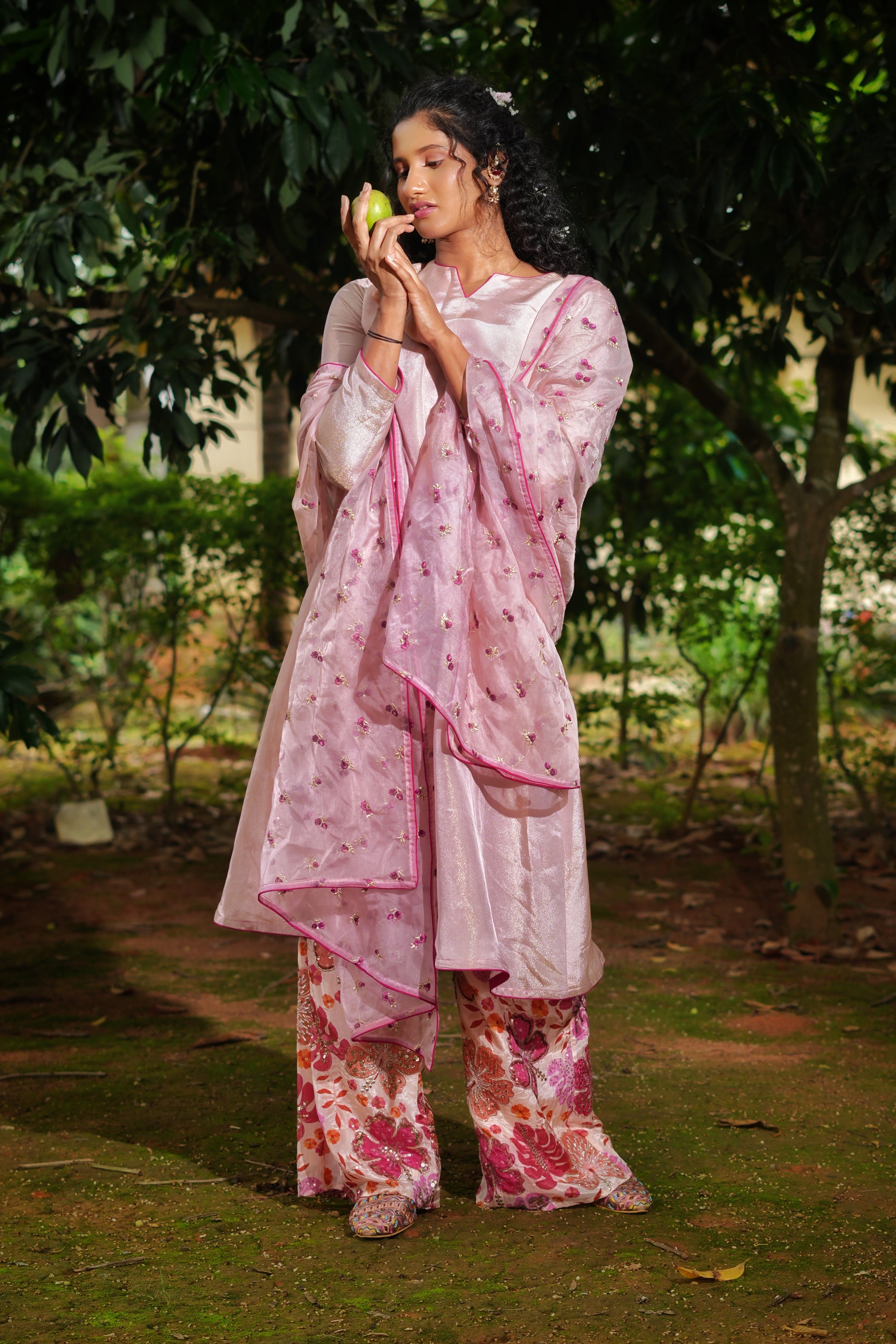 An elegant play of shimmer and print, the Gulbano Kurta Set features a long kurta in blush pink shimmer tissue, highlighted with contrast piping. Paired with a pure crepe floral pant and a dreamy organza dupatta sprinkled with tiny magenta flower embroidery, this look is a graceful blend of festive sparkle and blooming joy.
