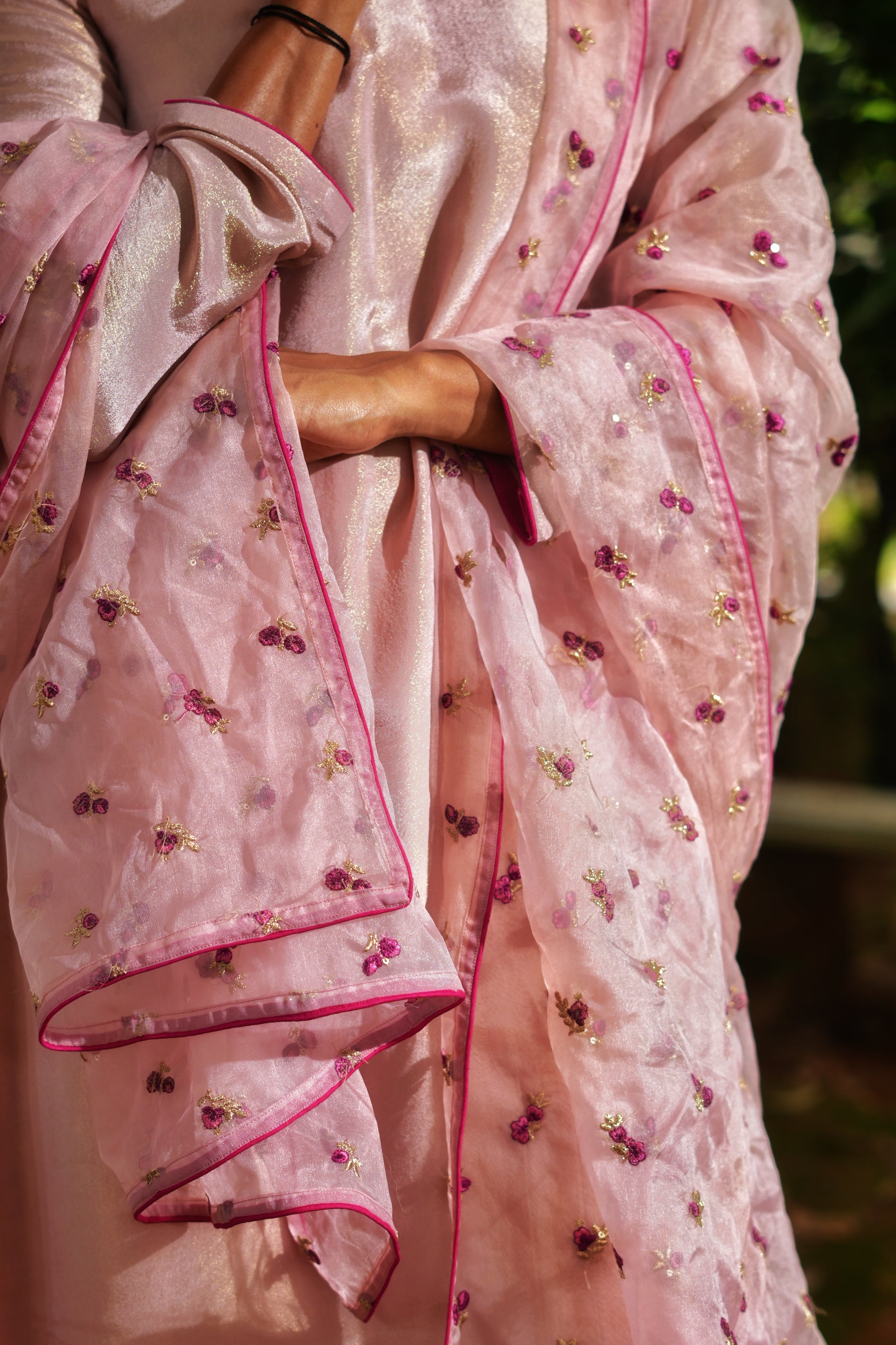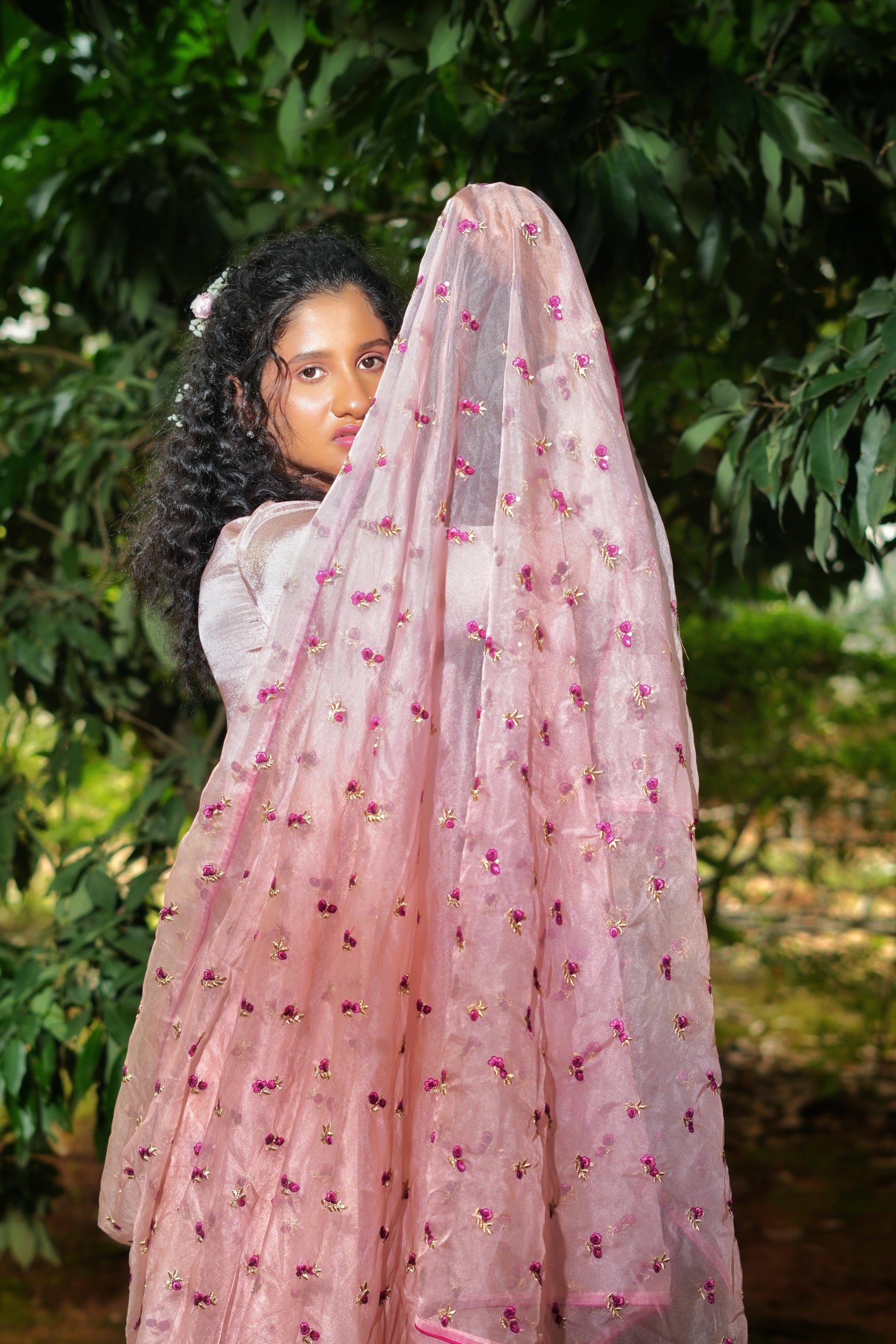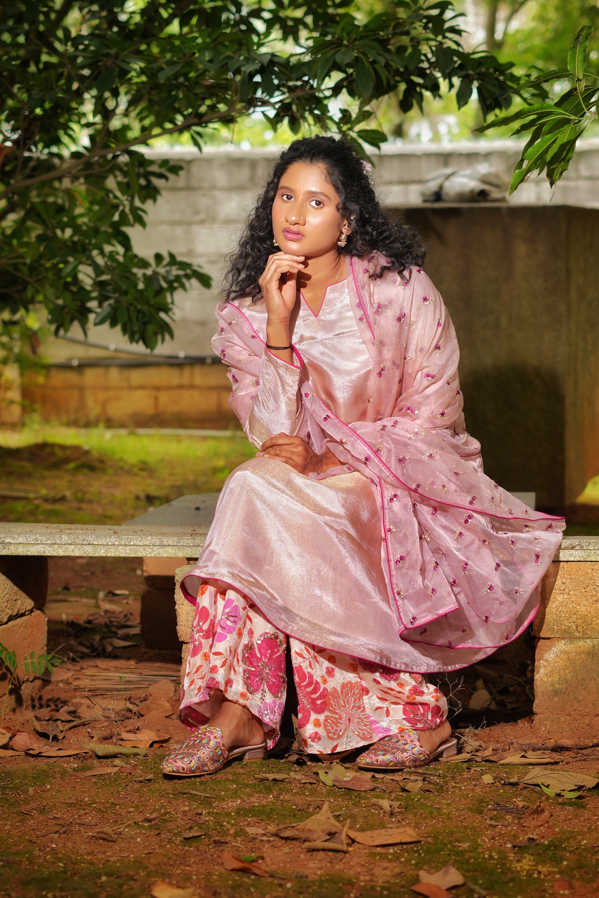 An elegant play of shimmer and print, the Gulbano Kurta Set features a long kurta in blush pink shimmer tissue, highlighted with contrast piping. Paired with a pure crepe floral pant and a dreamy organza dupatta sprinkled with tiny magenta flower embroidery, this look is a graceful blend of festive sparkle and blooming joy.