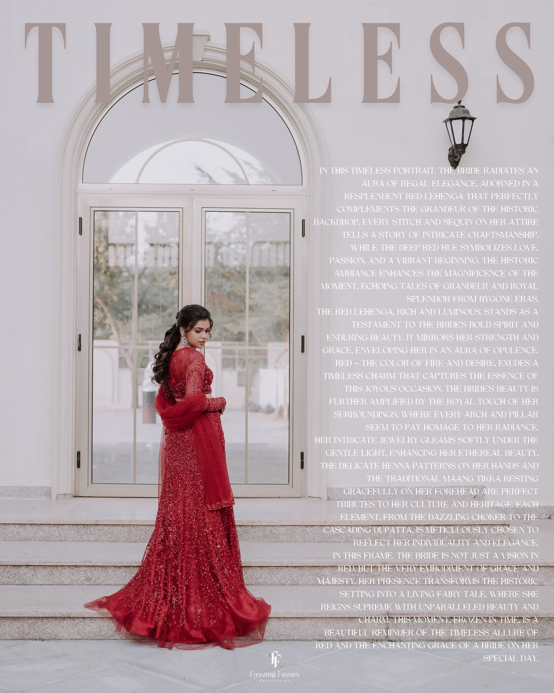 The blouse features delicate finishing details and the dupatta (or cape) adds fluid grace. Designed for the contemporary bride who wants to blend tradition with fashion-forward drama.