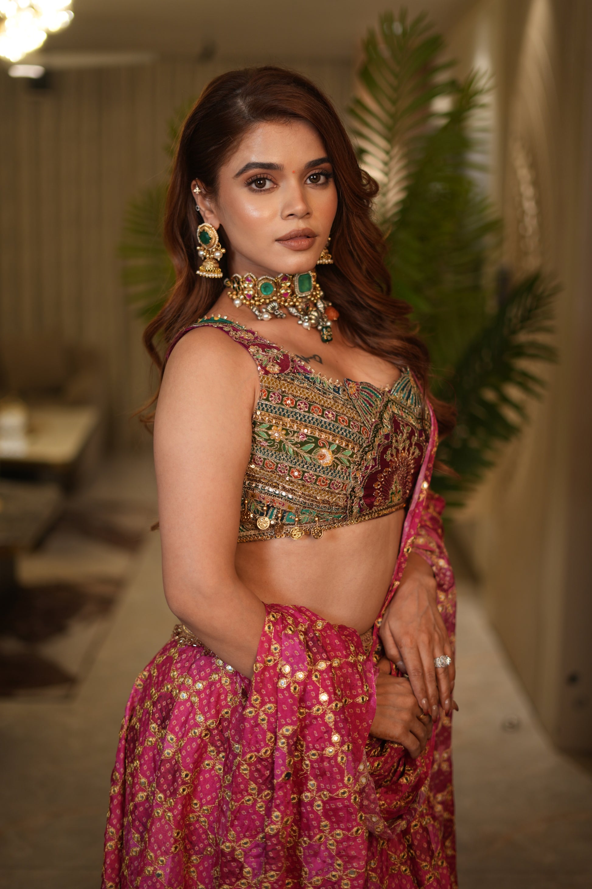 The Leher Lehenga Set is inspired by waves of festivity and grace. A soft chiffon skirt in shades of pink creates fluid movement, paired with a blue crepe blouse adorned with multi-color embellishments. The look is tied together with a delicate dupatta, completing the perfect balance of vibrance and sophistication.
