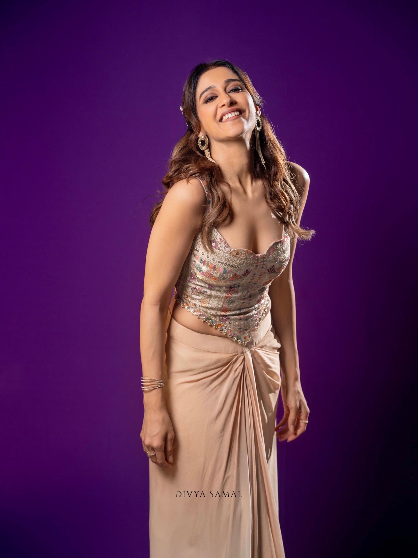 This nude-toned draped ensemble captures sensual elegance through fluid movement and sculpted detailing. The structured corset-style bodice, adorned with delicate artisanal motifs, contours the form with architectural precision, while the softly gathered skirt drapes seamlessly at the waist, flowing into an elongated silhouette. Set against movement and light, the design balances strength and softness with effortless grace. Modern, evocative, and confidently feminine, this look is crafted for moments that feel powerful, intimate, and unforgettable.