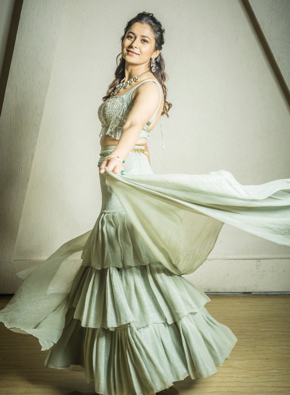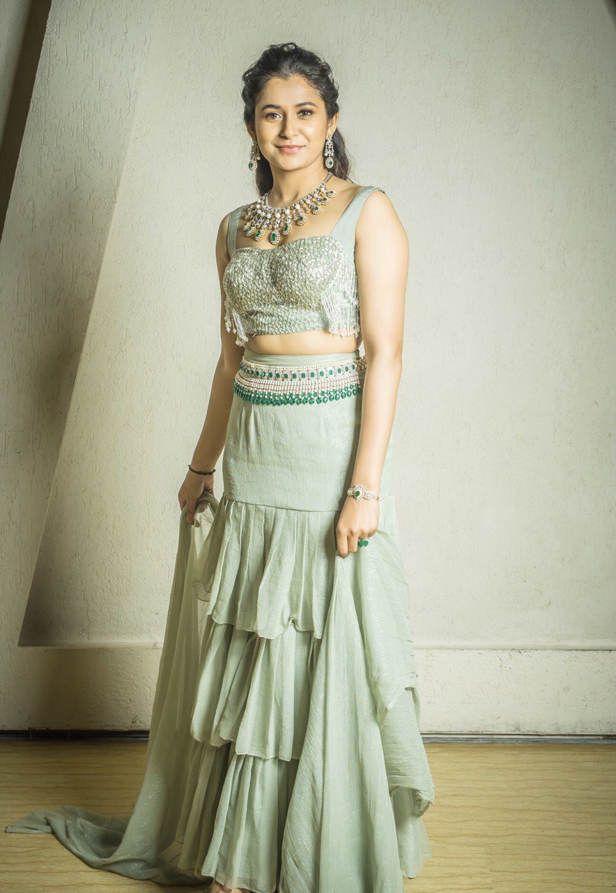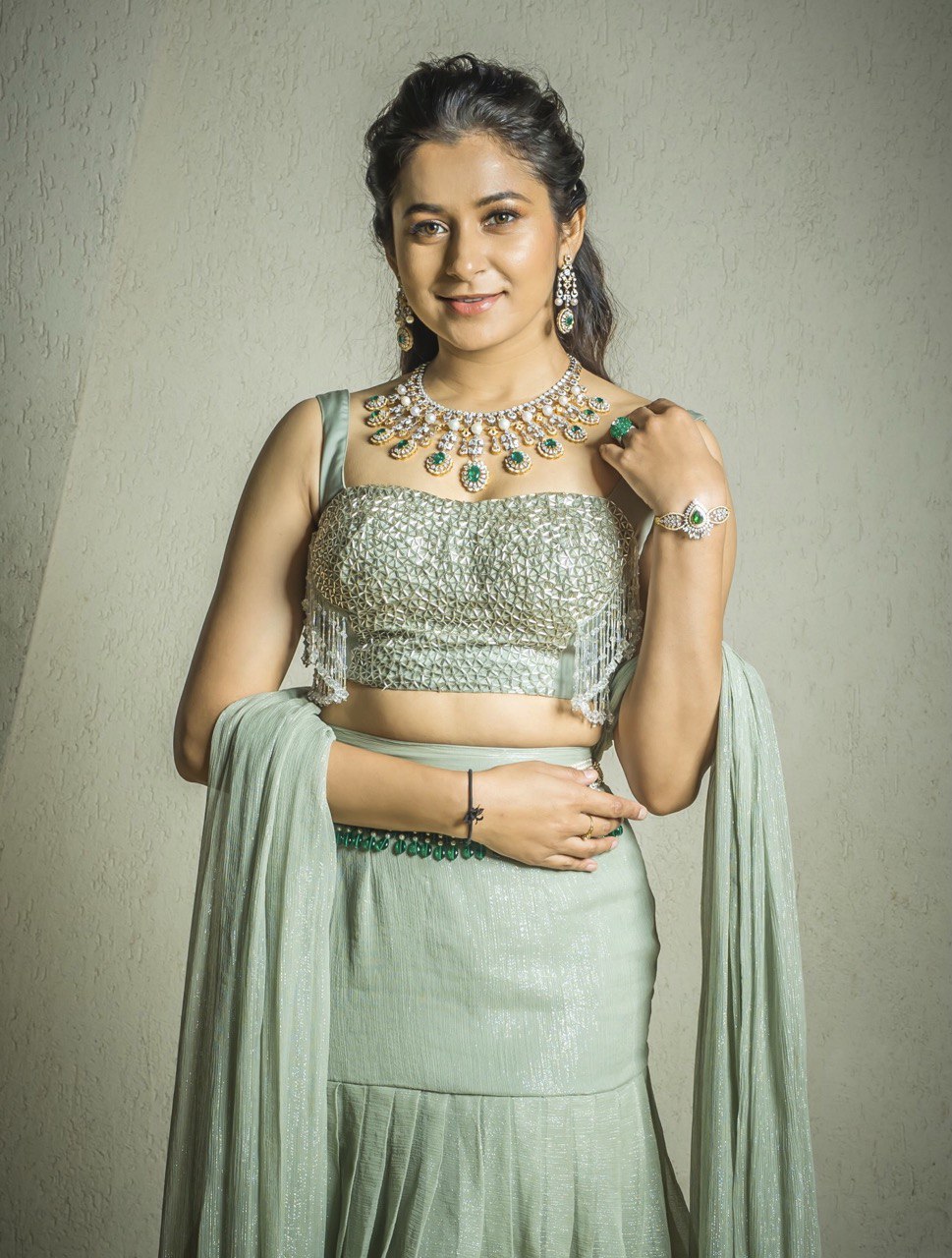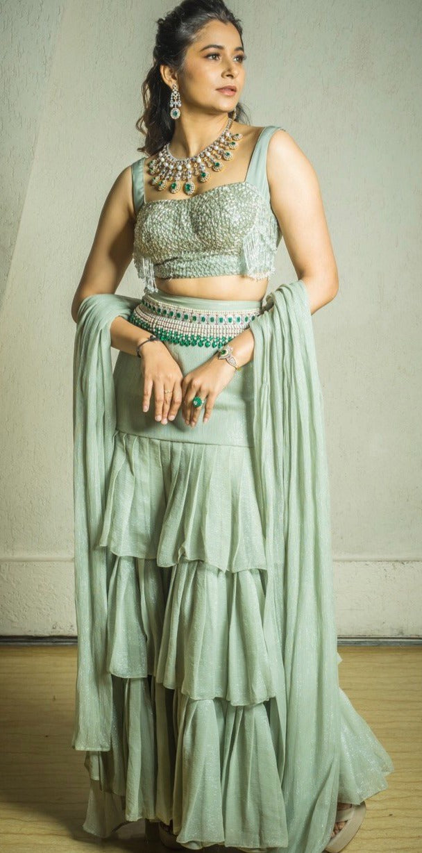 Fabric Details: Chiffon pleated ruffle skirt with chiffon dupatta and embellished blouse.
