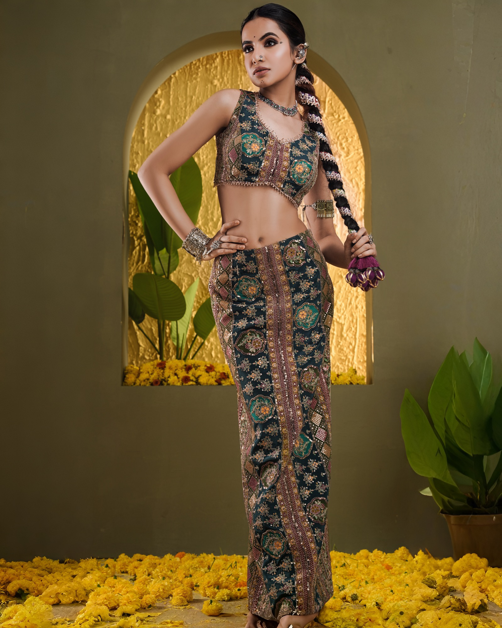 The Umang Co-ord Set is a symphony of colors and craftsmanship. A sleek multi-hued sheath skirt paired with a sculpted bustier blouse, designed to embody modern sophistication with celebratory charm.